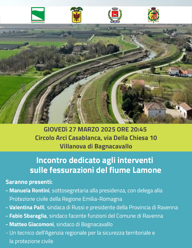 L'incontro di giovedì 27 marzo alle ore 20.45, dedicato agli interventi sulle fessurazioni del fiume Lamone, inizialmente previsto presso la Sala Azzurra, è stato spostato presso il circolo Arci Casablanca di Villanova di Bagnacavallo.